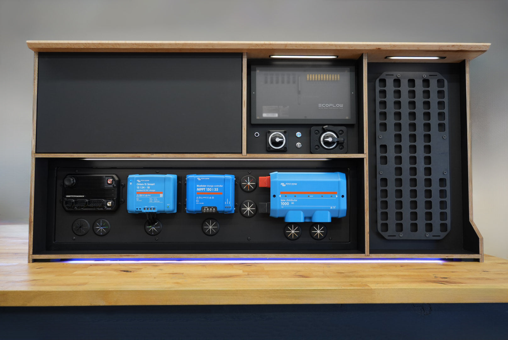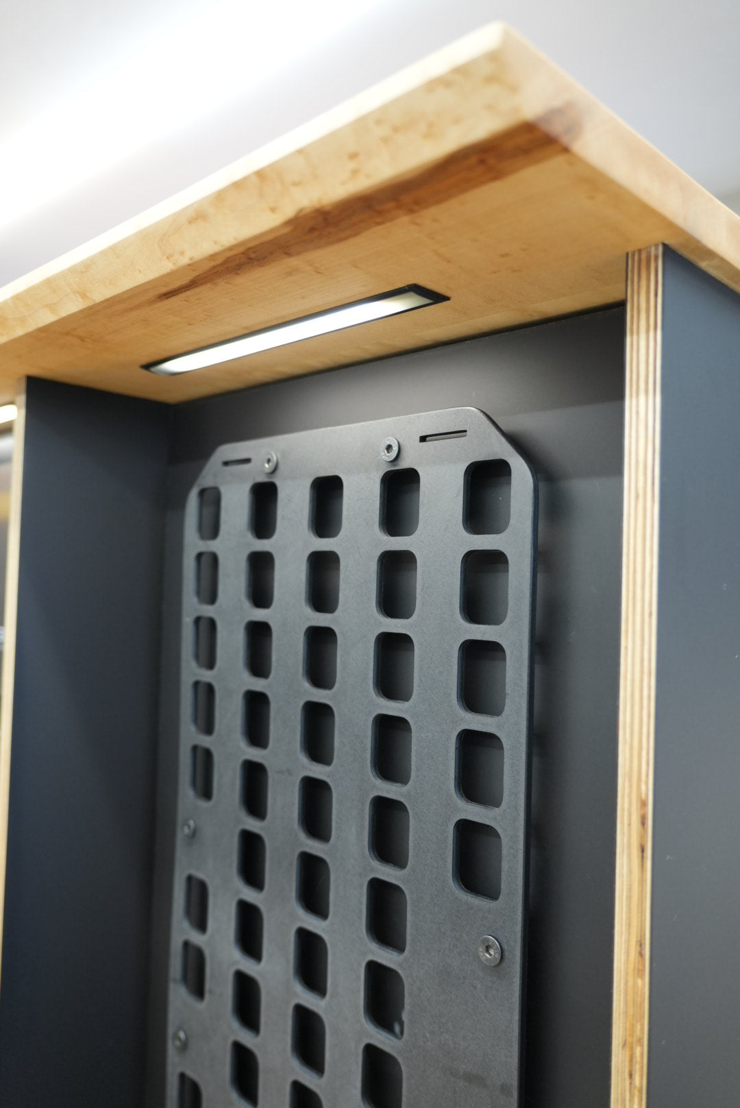 Our custom electrical cabinet is designed to seamlessly integrate into your Sprinter camper van, offering a practical and stylish solution for your electrical storage needs. Below are the standard dimensions: